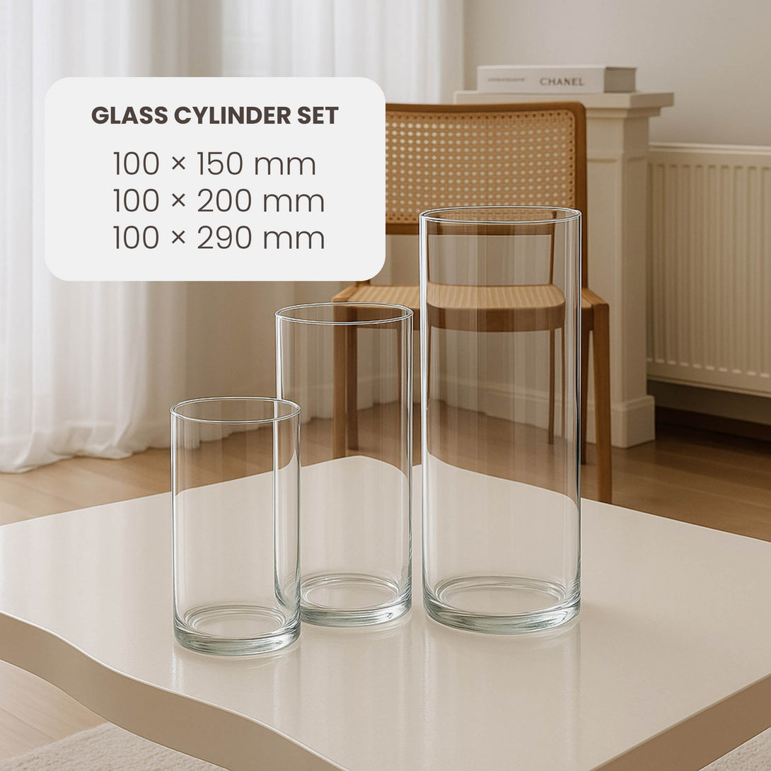 • 3-Glass Cylinder Set: 100 × 150 mm; 100 × 200 mm; 100 × 290 mm.