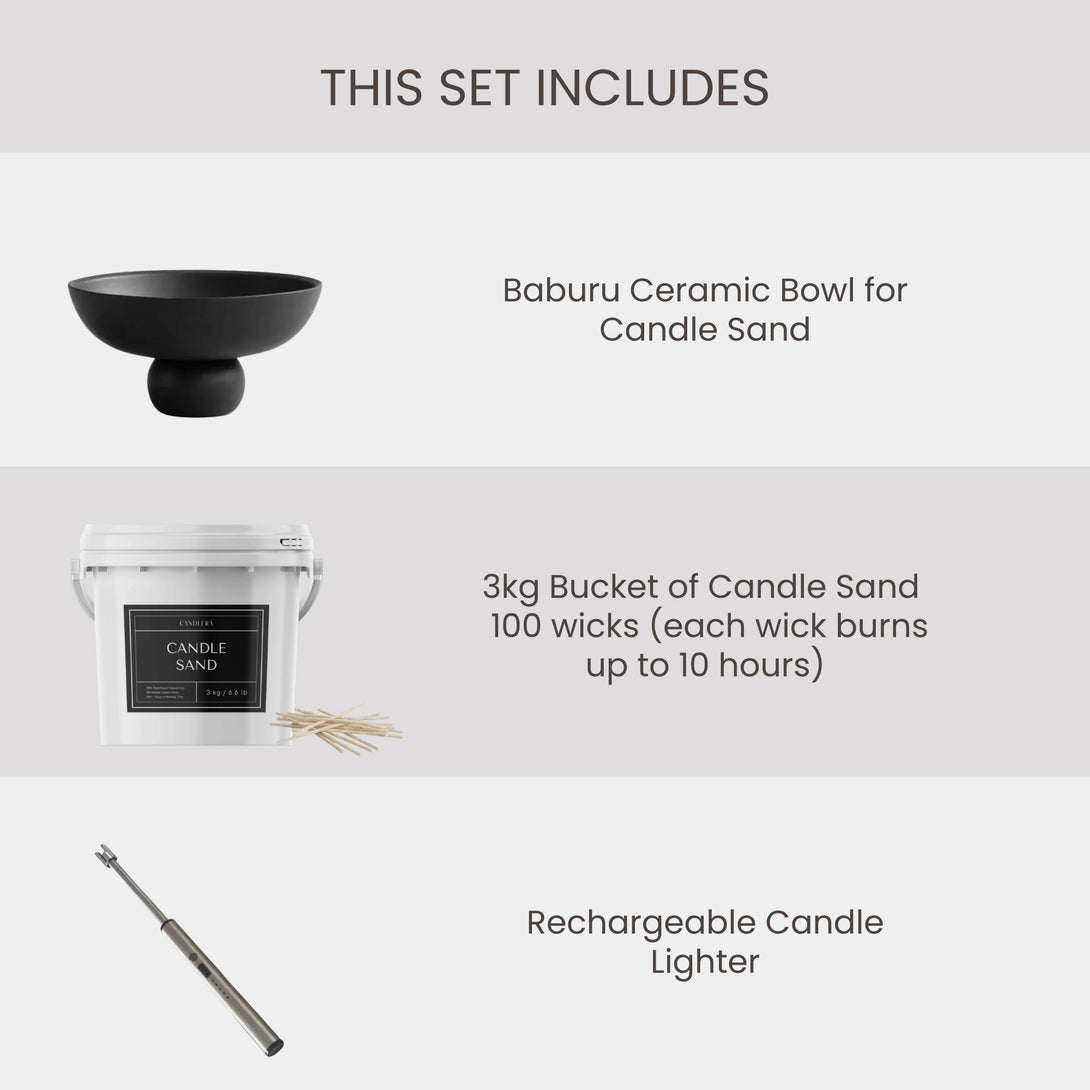 A: Each bundle is unique. The contents are carefully curated and may vary — that’s what makes each one special. You’ll always receive a mix of our most-loved Candle Sand, designer bowls, and accessories.