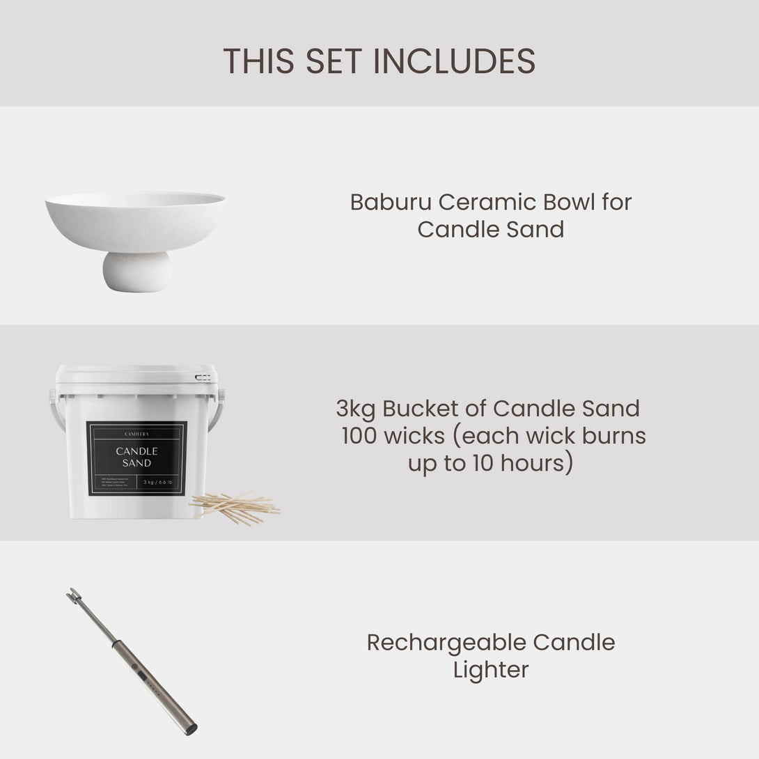 Place the wick into the sand (included in your set), light it, and enjoy the warm, ambient glow.