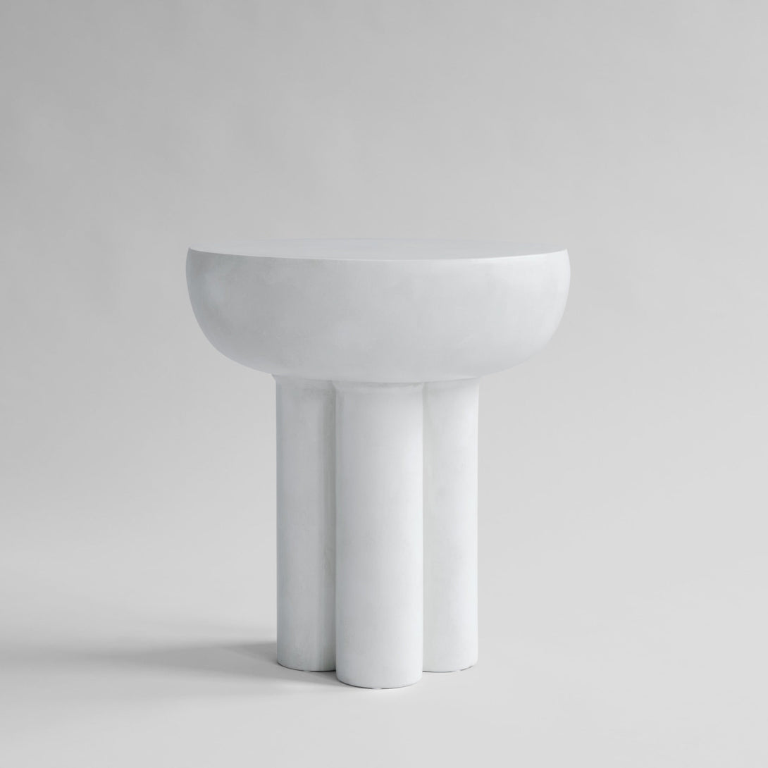 The Crown Table, Tall - Bone White by 101 Copenhagen embodies the raw elegance of Brutalist architecture in a minimalist form. Designed by Kristian Sofus Hansen & Tommy Hyldahl, this sculptural table features a circular tabletop supported by four robust cylindrical legs, crafted from fiber concrete in a single piece. The generous spacing between the tabletop and legs enhances the table’s floating effect, adding depth and character to any space. Perfect as a standalone side table or paired with the Crown Low Table, the bone white finish makes this piece a timeless and versatile addition to modern interiors.